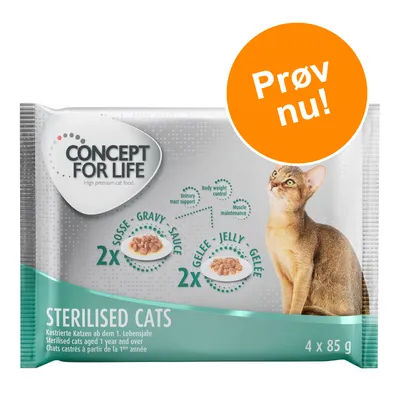 Concept for Life Sterilised prøvepakke indeholder: 2 x 85 g Sterilised i sauce og 2 x 85 g Sterilised i gelé.